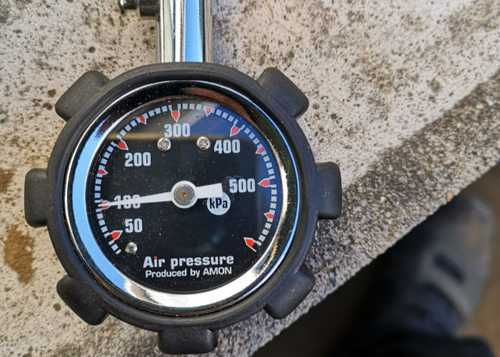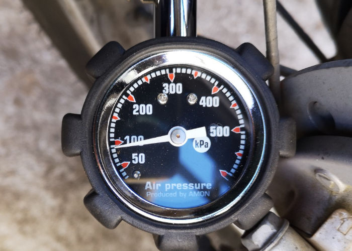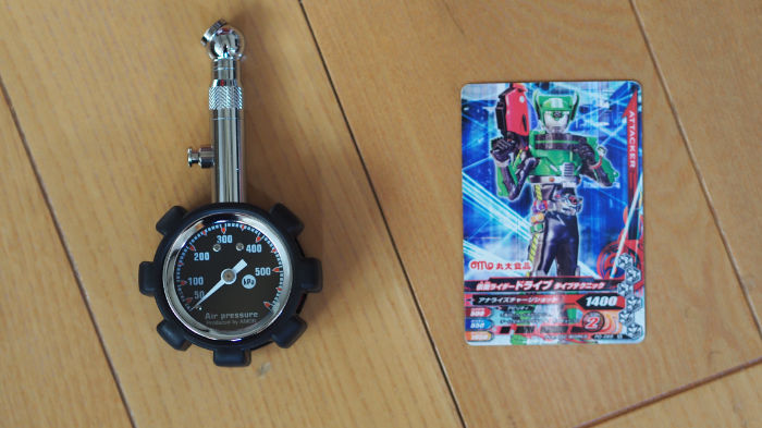 空気を入れは以前記事に書いた「踏みマッチョ!」を使用。実はこの空気入れの空気圧計を信頼していなかったのですがエーモンの空気圧計と比較して大きな差異はなく意外と正確なようです。ただし、細かい目盛りがないのでやはり目安に使う程度。