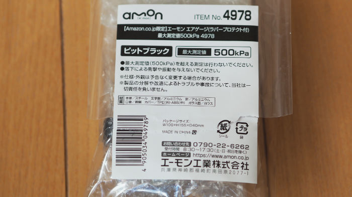 今回、点検に使用したのはエーモンのエアゲージ(ラバープロテクト付)です。最大測定値は500kPa。